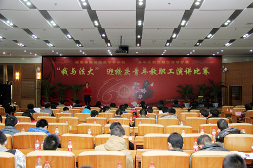 1月5日下午,作为迎接60周年校庆的序幕,“我与法大”迎校庆青年教职工演讲比赛决赛在昌平校区学术报告厅举办。来自法学院、国际法学院、幼儿园、饮食服务中心等12家单位的12名教职工从初赛中脱颖而出进入决赛。副校长马抗美,学校办公室主任李秀云,组织部部长王立艳,宣传部部长刘长敏,人事处处长吴平,团委书记王明宇,学生苏雪涛担任本次比赛的评委。