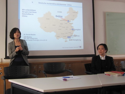 随后,德国商会北京代表处何昕法务副总监就法务部的工作作了介绍。她主要介绍了法务部工作的内容,并着重介绍了商会法务工作中经常涉及的合同法、税法、劳动法等问题。此外,她还就法务部实习生的岗位要求、实习内容等作了简介,并欢迎我院学生申请商会的实习生岗位;希望通过商会的平台,使我院学生得以在实务工作中运用、提高自身的专业知识。