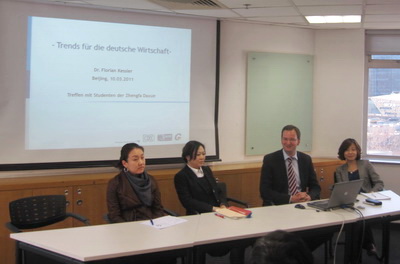活动由德国商会北京代表处总经理凯福安博士(Dr. Florian Kessler)主持。他首先热烈欢迎我院师生的到来,对我院与德国商会北京代表处合作建立的研究生实践基地表示充满期待。之后,他以翔实的资料和数据,就德国商会的情况、中德两国经贸关系、德国在华投资特点与前景等问题作了生动的报告。
