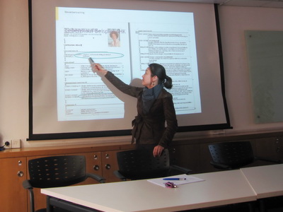 最后,德国商会北京代表处人力资源总监张弘女士为我院学生作了一场德国企业应聘培训讲座。张弘女士结合自己多年来从事人力资源工作的丰富经历,先后就德国企业的企业文化、求职中如何进行自我分析、求职职位选择、简历制作、求职信撰写、面试技巧等诸多细节进行了系统且详细的介绍。参加培训的同学纷纷感到受益匪浅。